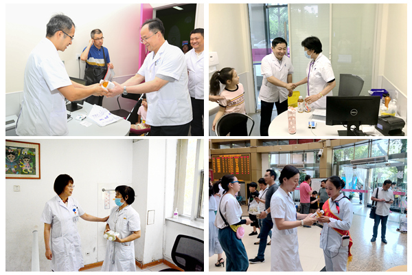 近日,党委书记陈宇宁、副院长莫绪明、李蒨、王倩等在院的院领导带领机关工作人员,亲切看望慰问奋战在两院区门急诊及窗口一线的工作人员。(工会)