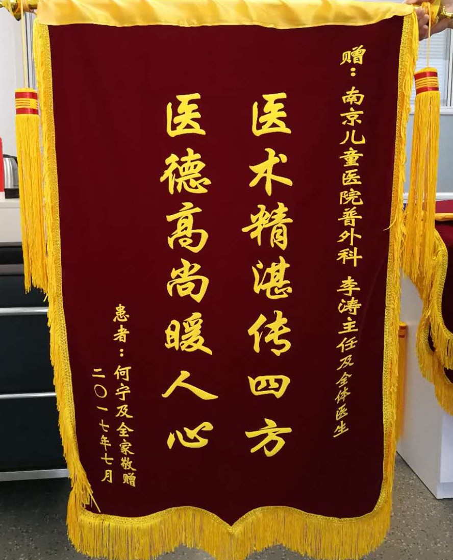 赠:南京儿童医院普外科 李涛主任及全体医生医术精湛传四方 医德高尚暖人心患者:何宁及全家敬赠二〇一七年七月
