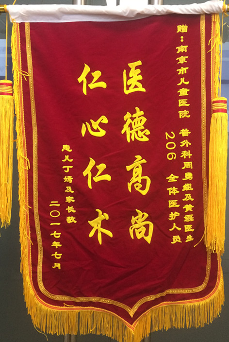 赠:南京市儿童医院 普外科周勇组及黄磊医生 206全体医护人员医德高尚 仁心仁术患儿丁嫣及家长敬二〇一七年七月