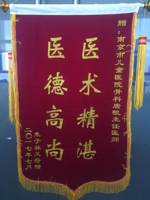 赠:南京市儿童医院骨科唐凯主任医师医术精湛 医德高尚朱子林父母赠二〇一七年七月