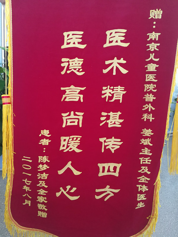 赠:南京儿童医院普外科 姜斌主任及全体医生医术精湛传四方 医德高尚暖人心患者:陈梦洁及全家敬赠二〇一七年八月