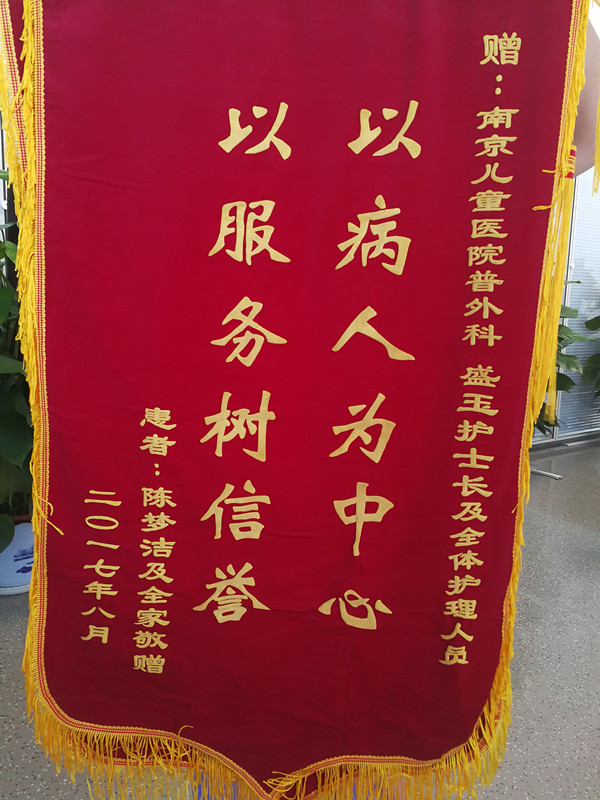 赠:南京儿童医院普外科 盛玉护士长及全体护理人员以病人为中心 以服务树信誉患者:陈梦洁及全家敬赠二〇一七年八月