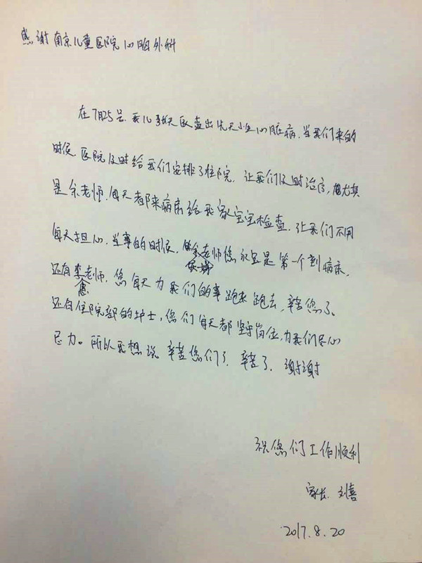 感谢南京儿童医院心胸外科家长 刘喜2017.8.20