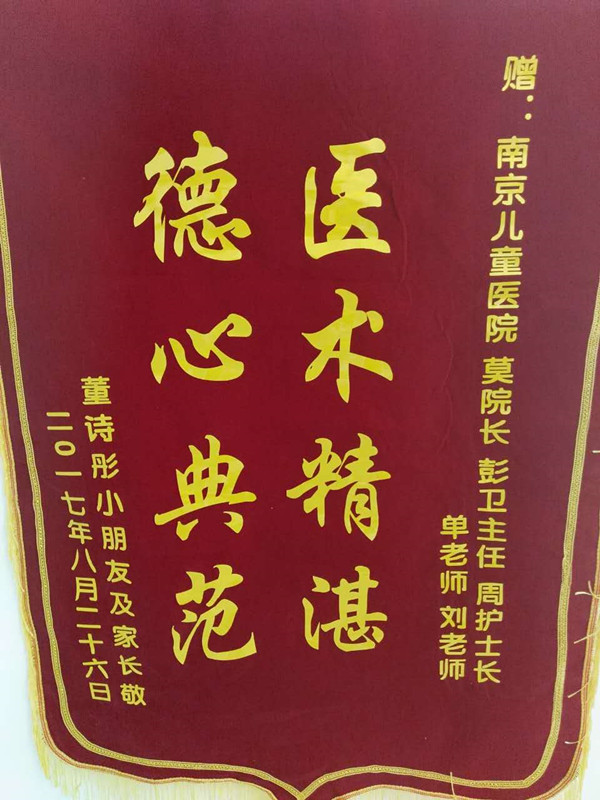 赠:南京儿童医院 莫院长 彭卫主任 周护士长 单老师 刘老师医术精湛 德心典范董诗彤小朋友及家长敬二〇一七年八月二十六日