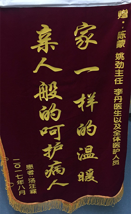 赠:陈蒙 姚劲主任 李丹医生以及全体医护人员家一样的温暖 亲人般的呵护病人患者:汤汪霖二〇一七年八月