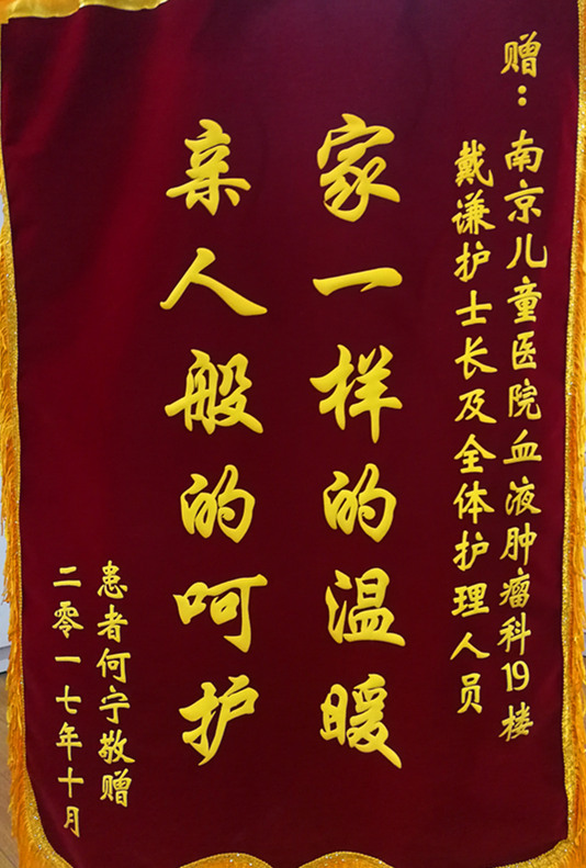 赠:南京儿童医院血液肿瘤科19楼 戴谦护士长及全体护理人员家一样的温暖 亲人般的呵护患者何宁敬赠二〇一七年十月