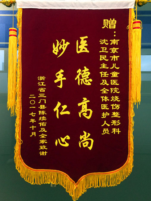赠:南京市儿童医院烧伤整形科 沈卫民主任及全体医护人员医德高尚 妙手仁心浙江省三门县陈续佑及全家致谢二〇一七年十月