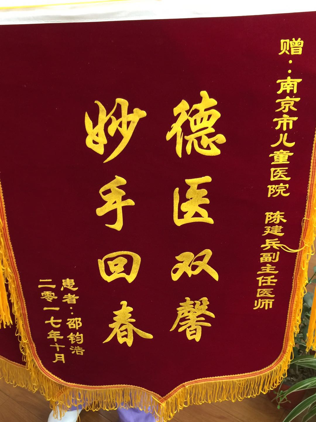 赠:南京市儿童医院 陈建兵副主任医师德医双馨 妙手回春患者:邵钧浩二零一七年十月