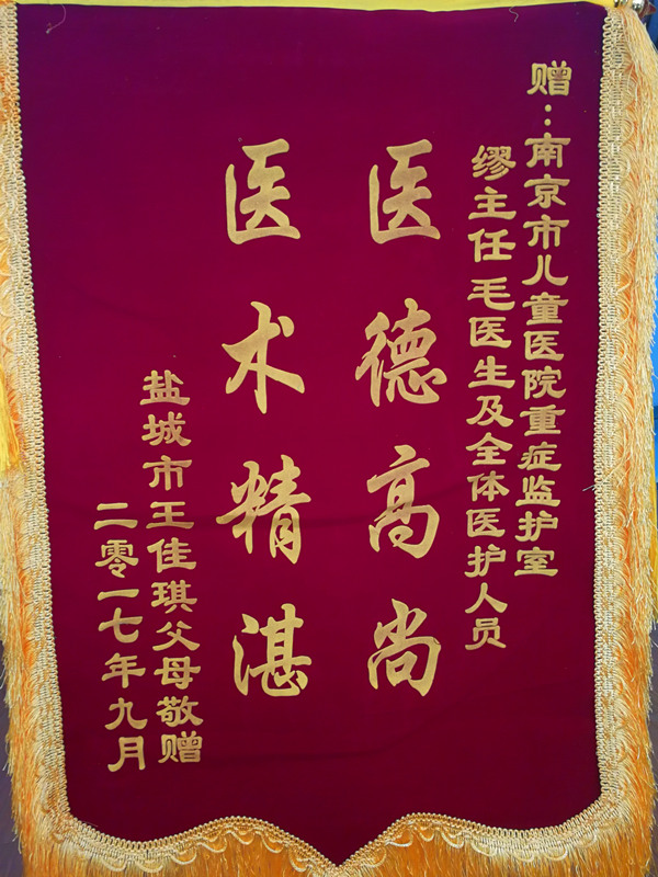赠:南京市儿童医院重症监护室缪主任毛医生及全体医护人员医德高尚 医术精湛盐城市王佳琪父母敬赠二零一七年九月