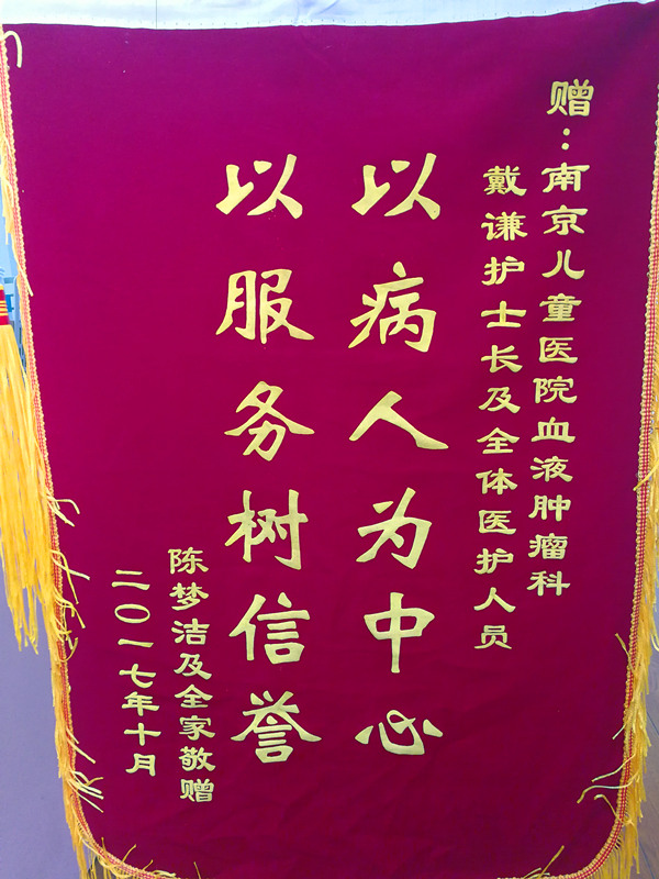 赠:南京儿童医院血液肿瘤科 戴谦护士长及全体医护人员以病人为中心 以服务树信誉陈梦洁及全家敬赠二〇一七年十月