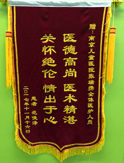 赠:南京儿童医院张瑞携全体医护人员医德高尚 医术精湛 关怀绝伦 情出于心患者 范俊泽二〇一七年十一月十六日