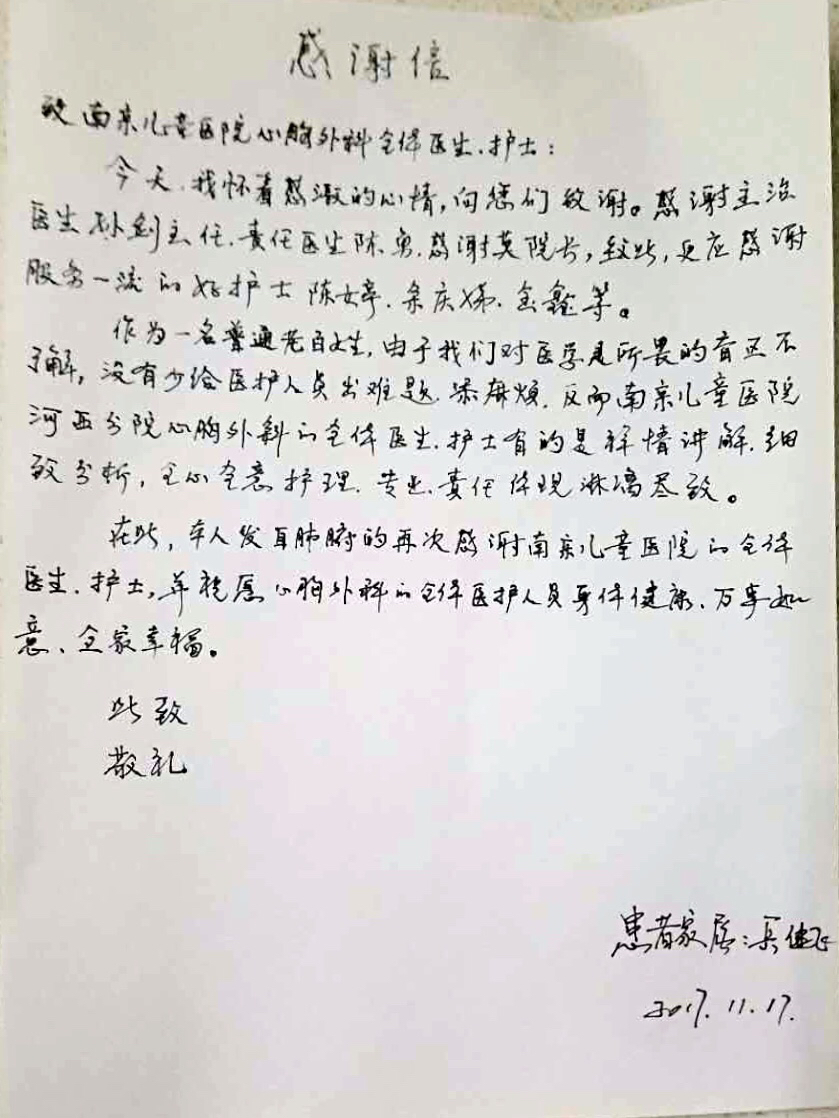 感谢信_心胸外科(210A病区)_20171122_孙剑、陈勇、莫绪明、陈婷、余庆娣、金鑫