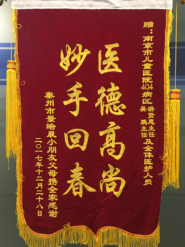 赠:南京市儿童医院404病区游贤惠主任 吴鹏主任及全体医护人员