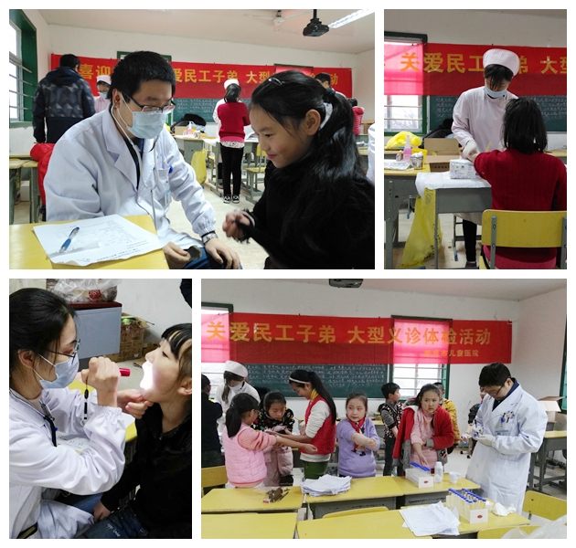 1月5日上午,南京儿童医院组织急诊科、儿童保健科、检验科的9名医护人员来到南京市宁燕外来工子弟小学开展“喜迎新年 关爱打工子弟”大型体检义诊活动,免费为60名外来工子弟进行体格检查包括(内科检查、外科检查)以及血尿常规等体检,在寒冷的冬日里给孩子们送去特殊的新年礼物。(检验科)