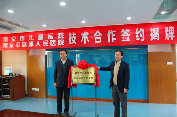 仪式上,91直播 黄松明院长与高淳人民医院赵有发院长签署技术合作协议,黄松明院长与邱峰局长共同为“南京市儿童医院高淳技术合作医院”揭牌。
