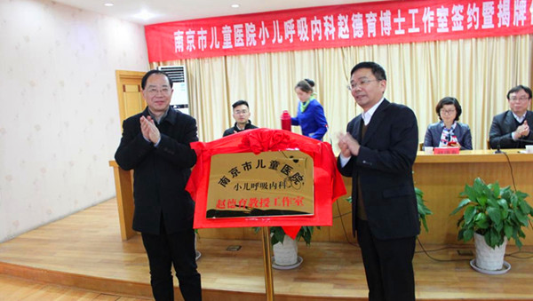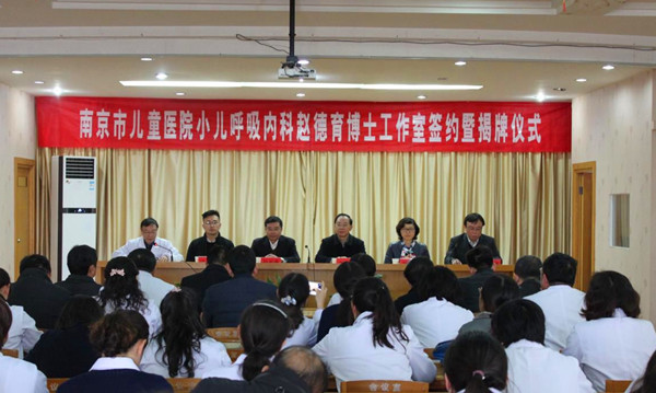 12月27日下午,91直播 “小儿呼吸内科—赵德育博士工作室”签约暨揭牌仪式在盐城妇幼保健院举行。盐城市政协副主席、市卫计委副主任孙长春、盐城妇幼保健院院长卞洪亮、副院长刘伟东,91直播 党委书记金福年、内科行政主任赵德育、社会发展工作部主任钱昆,及两院相关职能科室负责人参加了签约揭牌仪式。