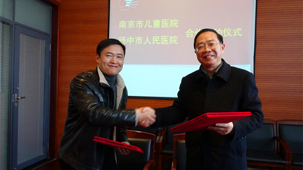 院党委书记金福年与扬中市人民医院院长朱进华签署合作协议,并为“南京市儿童医院儿科急诊医学工作室”揭牌。
