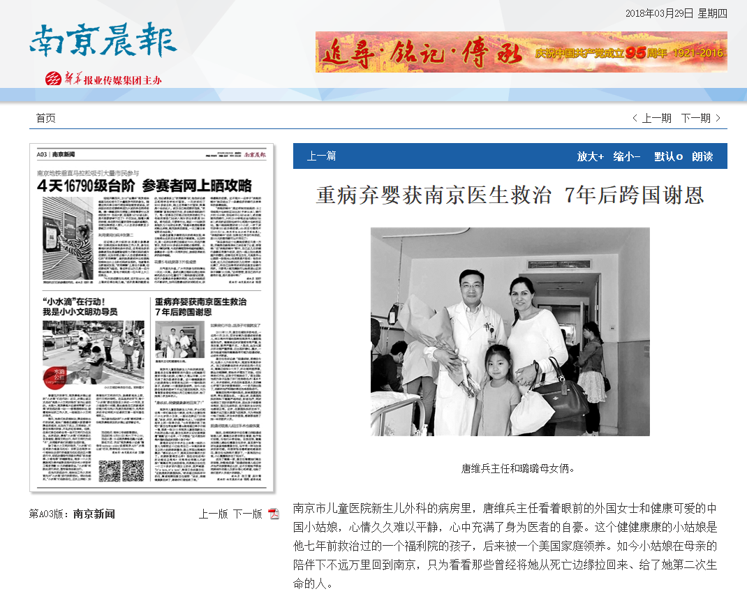重病弃婴获南京医生救治 7年后跨国谢恩——《南京晨报》://njcb.xhby.net/mp2/pc/c/201803/29/c462479.html
