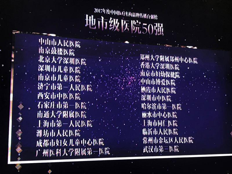在“2017年度中国医疗机构品牌传播百强榜公立医院(地市级)50强”中位列第五。