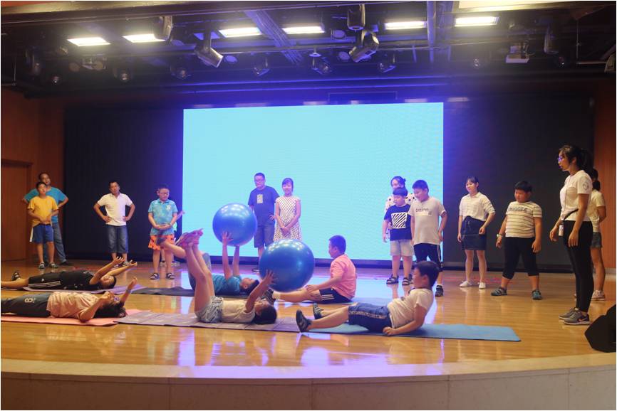 接着,南师大体育与健康教育学院的付乐老师以“慧吃慧动 健康体重”为主题,现场带领肥胖儿童以及家长进行互动和游戏,有跳绳、瑜伽球、平板撑、数字游戏等互动环节,现场气氛非常活跃。