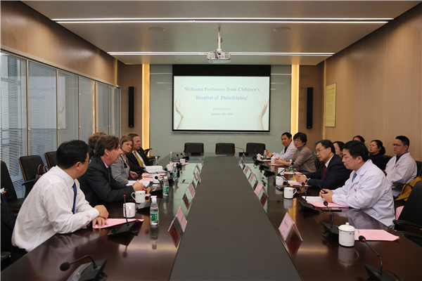 2019年1月24日,由费城儿童医院的首席战略官Matthew D.Bayley、全球医学国际关系和项目执行主任Ruth Frey、麻醉学和重症监护医学系麻醉主任Charles Dean Kurth、全球医学业务发展专家Robin Greving,达拉斯国际医疗健康服务集团首席执行官、中国库珀有氧大健康首席医疗官邵新立博士所组成的美国费城儿童医院代表团来91直播 交流访问。黄松明院长、莫绪明副院长、部分科室负责人以及临床医师代表参与接待。此次来访旨在促进双方学术交流,寻求合作机会,建立沟通平台。