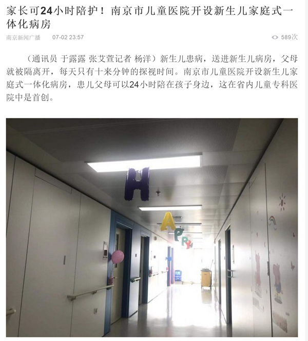 6、南京新闻广播——家长可24小时陪护!南京市儿童医院开设新生儿家庭式一体化病房://oriental.zainanjing365.com/siteapp/gdmm/jsp?service_name=gdmmArticle&method_name=shareJsp&id=53552&appscheme=gdmm-znj