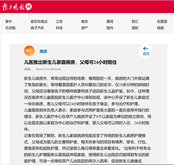 1、《新华日报》——南京启用新生儿家庭式病房://xh.xhby.net/mp3/pc/c/201907/03/c653768.html