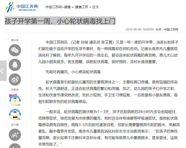 2、《凤凰网江苏》:孩子开学第一周,小心轮状病毒找上门//js.ifeng.com/a/20190909/7721820_0.shtml