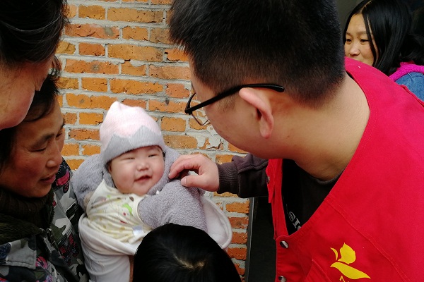 到淇浚家的时候,淇浚宝宝要出院了,小家伙全身裹着被子,被妈妈抱在怀里。不知是否是在医院病房习惯了陌生面孔,见到我们一行人到来,淇浚并未哭闹。一旁,淇浚妈妈在向秦老师诉说着家庭生活的不易和对基金会的感激,在交谈中,我了解到,淇浚爸爸身患癌症、已经是晚期,哥哥全身瘫痪,家里除了这间住人的有了一二十个年头的砖瓦房,一贫如洗,淇浚当时的治疗费用主要是由基金会承担。秦老师一边安慰淇浚妈妈,一边拿出专门为小家伙准备的益智手摇铃玩具和狗狗玩偶,并殷切叮嘱淇浚妈妈手摇铃一定要经常给小淇浚玩耍,促进他的智力发育。在离开前,我望着棉被里的淇浚,冲他做了个鬼脸,对他说道:“小家伙,你一定要健健康康长大呀。”小家伙突然朝我露出微笑,还没长出牙齿的嘴巴咧开一道小小的缝隙,仿佛下一刻,这个小躯体里盛载的所有纯洁和快乐,都要从那儿蓬勃而出,我的心,也在一瞬间暖化。人人都想借天使的翅膀抓住云间的彩虹,却不知,天使已在人间。
